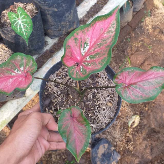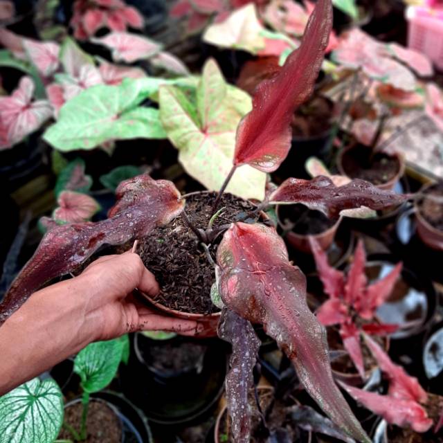 Jual aneka jenis tanaman keladi tanaman keladi caladium sp adalah tanaman berbunga yang termasuk keluarga araceae tanaman ini berasal dari amerika selatan dan tengah yang kemudian dinaturalisasi di india sebagian afrika dan berbagai pulau di wilayah tropis. Dalam bahasa sehari hari keladi kerap juga dipakai untuk menyebut beberapa tumbuhan lain yang masih sekerabat namun tidak termasuk caladium seperti talas colocasia. Tinggi kuping jerapah ini bsa mencapai 1 1 5 meter.